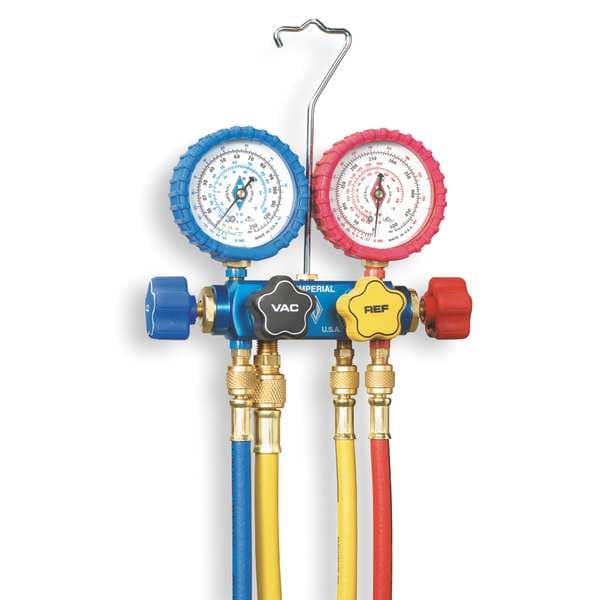 Manifold Gauge, Number of Valves 4, R-134A, Number of Hoses 4, 5 ft, 0 to 500 psi, 30 in Hg to 350 psi, 3/8 in, Oversize Internal Passages, Easy to Read Color Coded Scales, Ergonomic Handles, Pulsation Resistant Gauges, UL Listed, Includes Hi Performance Hoses, 800 psi Working Pressure, 4,000 psi Burst Pressure