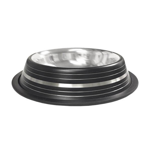 The Non-Tip Anti-Skid Bowl has a colored silver stripe design. It is made out of stainless steel with 100% natural rubber bottom to prevent spillage and movement.