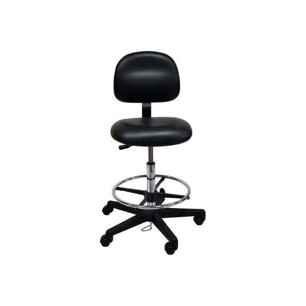 Esd-safe vinyl clean room stool with nylon base with drag chain black 300 lbs. Capacity 17" w x 17" d seat with 3" high resilient density foam plastic nylon base with drag chain chrome back bar back 15" w x 12" h seat range 19"-27" weight 32 lbs.