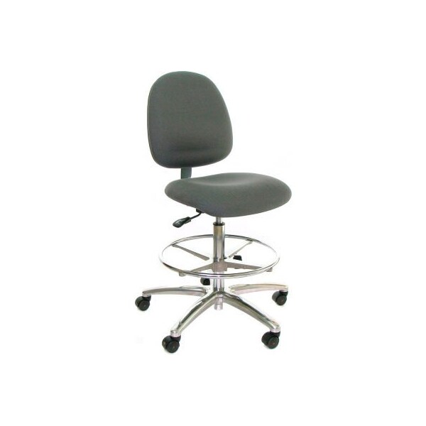 Mid back conductive fabric stool with aluminum base& foot ring black super heavy duty 450 lbs. capacity. 18" wide x 18" deep with front waterfall contour seat and 2-1/2" high resilient density foam for better comfort. aluminum base with esd casters. 18" footring. black back bar. seat range 21"-31". back 16" w x 16" h. weight 34 lbs.