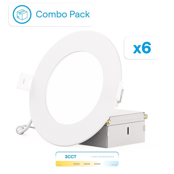 4 In 3CCT Selectable 9W 750LM Thin LED Ceiling Light Kit, Dimmable, Wet Rated, 6PK