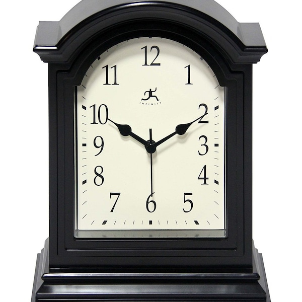 A new addition to the Infinity Instruments tabletop line is our attractive Grandfather-inspired tabletop clock. This simple tabletop clock is a welcome style addition to your mantle, living room table, or bedroom. This clock features a rich black finish, hard plastic lens, and Old World-inspired clock face complete with eye-catching artwork. Measuring just 9” x 6”, this Grandfather-inspired tabletop clock is the perfect complement to any smaller design pieces you have in your living room or bedroom.