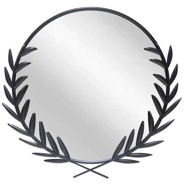 22 in Round Indoor Mirror, Black Finish, Decorative Grecian-Style Branch Accents, Keyhole Hanging Mechanism