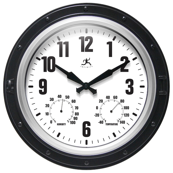 16 in Round Wall Clock, Black & Silver Finish Case, Glass Lens, Built-in Hygrometer, Built-in Thermometer, Water Resistant