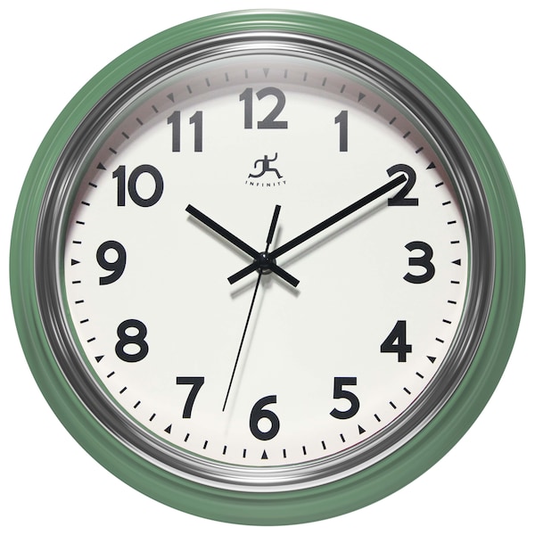 12 in Round Wall Clock, Green Finish Case with Silver Accent, Second Hand, Silent Movement