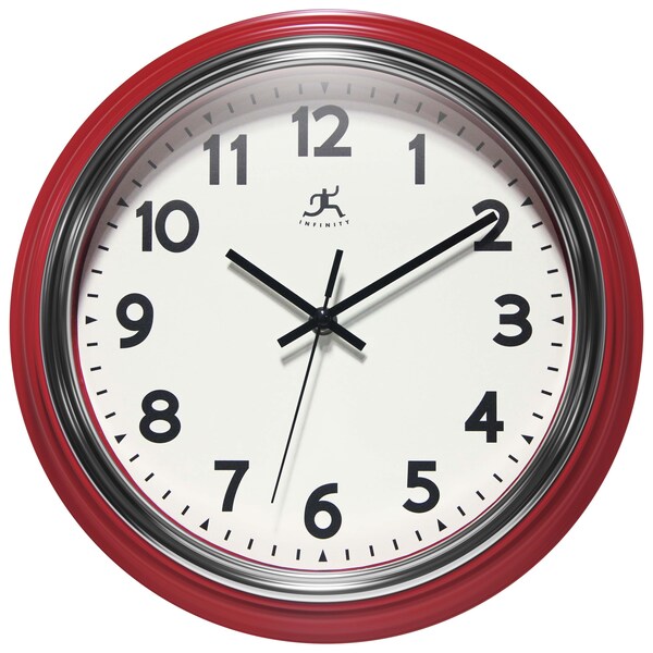 You'll love the vintage feel of this lovely 12 in. wall clock. The red outer case is accented by a bright silver ring, bringing attention to the white face and black metal hands. Reading the time from across the room comes with ease, and you won't be bothered by any annoying ticking sounds due to the silent movement.