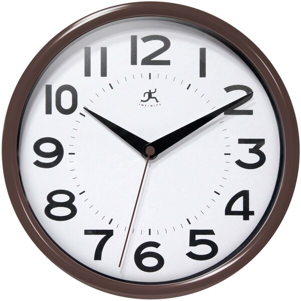 Keep track of time without disturbing co-workers by using this Metro resin analog wall clock. The silent hand movements ensure quiet operation to keep noise to a minimum, while the broad face and large numerals make this clock easy to read from afar. This Infinity Instruments Metro clock has an elegant design and sleek brown case for easy matching.