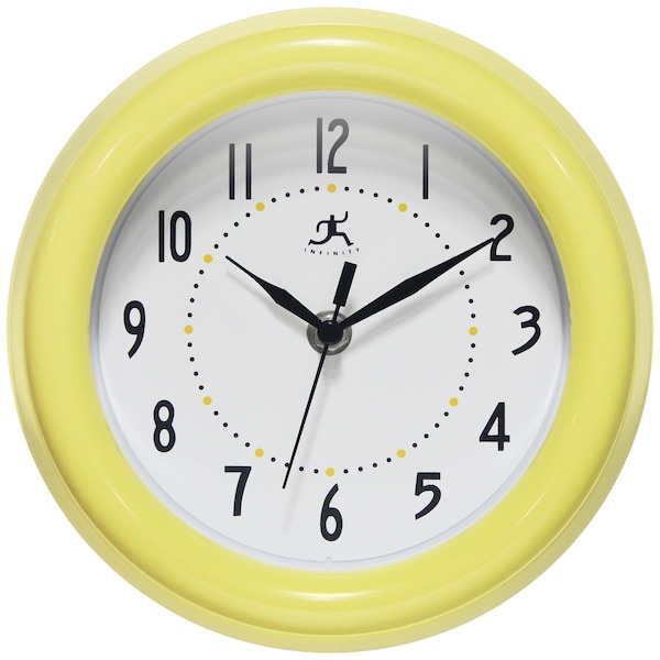 Do you need a clock for those small spaces? Infinity Instruments' Spartan wall clock fits the bill! At just 8 in. in diameter, this small clock still makes it easy to read the time with its white face and black metal hands. The yellow plastic case is 2-1/4 in. deep, and the second hand and the silent movement are other great features you'll enjoy.