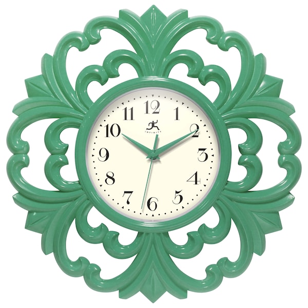 With its elegant and refined decorative casing, this clock is sure to draw attention. Perfect for your bedroom or living room, this 15.5 in. clock features a beautiful green resin casing and a lovely off-white clock face with accenting green metal hands. The silent movement ensures peace and quiet in whatever room you hang it in.