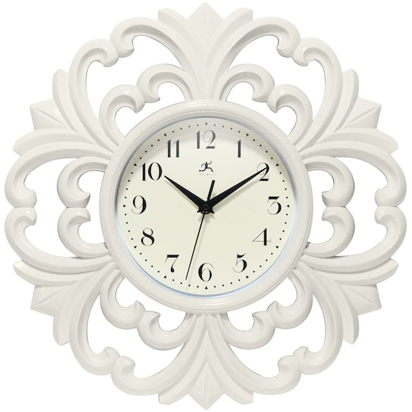 With its elegant and refined decorative casing, this clock is sure to draw attention. Perfect for your bedroom or living room, this 15.5" clock features a beautiful ivory resin casing and a lovely white clock face with accenting black metal hands. The silent movement ensures peace and quiet in whatever room you hang it in.
