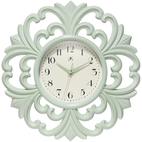 With its elegant and refined decorative casing, this clock is sure to draw attention. Perfect for your bedroom or living room, this 15.5" clock features a beautiful mint green resin casing and a lovely off-white clock face with accenting green metal hands. The silent movement ensures peace and quiet in whatever room you hang it in.