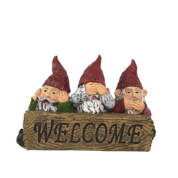 A Welcome garden Gnome sign with three cute Gnomes in Hear No Evil See No Evil Speak No Evil poses.
