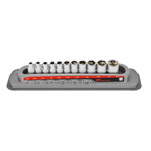Ingersoll Rand® 6-point shallow sockets are constructed of industrial-grade Chrome Vanadium steel that exceeds ANSI standards. Each socket is finished with mirror-polished chrome plating. Ingersoll Rand® signature vertical knurling offers better grip and easier handling (especially with greasy hands). The set includes a patent-pending thermoform socket tray that keeps sockets organized and easy to identify by standing sockets on end for 360-degree visibility, while economizing space in the tool box. • SAE SIZES: 5/32, 3/16, 7/32, 1/4, 9/32, 5/16, 11/32, 3/8, 7/16, 1/2, 9/16 Inch • PREMIUM MATERIALS: Mirror-Polished Industrial-Grade Chrome Vanadium Steel • EASIER HANDLING: Vertical Knurling Offers a Better Grip • INCLUDES: Patent-Pending Durable Thermoform Plastic Socket Tray Featuring 360° Visibility • QUALITY BUILT: Exceeds ANSI Standards for Torque, Fit and Finish • COLOR: Mirror Polished Chrome Plated Finish • MATERIAL: Chrome Vanadium Steel Material