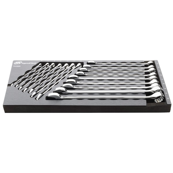 Ingersoll Rand® EVA Tray Master Mechanic's Tool Sets feature laser-cut foam organizer trays that drop easily into any tool chest drawer. Each set combines the most commonly used technician hand tools with 100% size coverage. You can easily build a complete tool collection or add to an existing one with these convenient tool tray sets. • EFFICIENT AND STYLISH: All EVA trays are finished with a brushed aluminum like top layer that adds style and durability to each set. Each tray is clearly marked with the size and type of each tool so you spend less time searching for the right tool and get the job done faster. • ADDED CLEARANCE AND TORQUE: 5 Degree Offset on Box End for Added Clearance and Extra-Long Handles for Added Reach and Torque • FINISHED Non-Slip Open End Design Grips and Holds Fasteners to Prevent Slipping; Constructed from Premium Chrome Vanadium Steel • QUALITY: Meets or Exceeds ANSI Standards for Torque, Length and Hardness • CONTAINS: Non-Slip Metric Combination Wrenches in sizes 6, 7, 8, 9, 10, 11, 12, 13, 14, 15, 16, 17, 18, 19, 21, 22 mm • COLOR: Mirror Polished Chrome Plated Finish • MATERIAL: Cr-V Steel Material