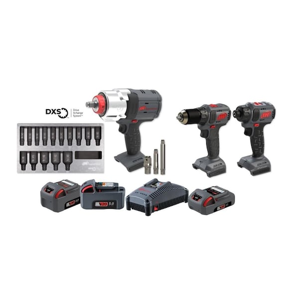 Ingersoll Rand IQV20-3W7D3 IQV20 20V Impact Wrench Cordless Power Tool Kit - 3 ToolsFeatures and Benefits:W7153 DXS Cordless Impact Wrench combines robust versatility with exceptional value to deliver the power of pneumatic in a cordless tool that works smarter, not harder.Features the patented DXS Drive Xchange System that uses a proprietary spline-type interface and fast-swap, interchangeable drives, so you can perform multiple jobs with one tool without compromise.With 1,600ft-lbs. of breakaway torque and a lightweight, compact design, the W7153 offers best-in-class performance that eliminates the need for adapters and extensions.Ditch your adapters and experience the versatility of the industry's most compact high torque cordless impact wrench.W7153 Impact Wrench Performance: 1600ft-lb. Torque, 2450 Blows per Minute, 1900 RPM, Variable Speed Throttle, 6.1 lb w/o Battery, 8.3L, Brushless Motor, IPX6-certified, UL Listed, Csa Certified, Impact and chemical-resistant composite housing and patented steel reinforced frame, 360? shadowless task light with 4 dimmable settings. 5 yr. Limited Warranty.Never lose power from worn sockets and square drive anvils with Drive Xchange System Sockets and enjoy easier access into tight spaces with up to shorter tool length when use with Ingersoll Rand DXS impact wrenches.DXS direct drive sockets fit tighter and have more load bearing surface compared to traditional square drives to deliver up to 15% better torque transfer and 20% longer wear life.Maintain the torque power output by replacing your worn anvil in less than a minute. Sockets have high visibility laser etched markings to easily identify the size you need.Impact-grade toughness chrome-molybdenum CR-MO alloy steel with manganese phosphate finish to resist corrosion. Relieved 6 point Hex corners help reduce faster rounding.Ball nose retention pin for quick, tool-free installation and removal.,