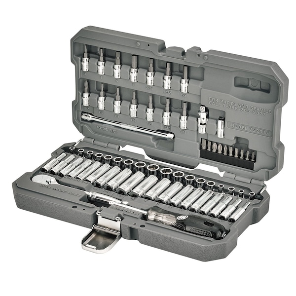 The Ingersoll Rand® 66 piece 1/4-inch drive master mechanic's socket set combines the most commonly used technician tools in a comprehensive all-in-one collection. The set includes 51 SAE and metric sockets, a 72 tooth ratchet and 14 tools and accessories. All Ingersoll Rand® master mechanic tool sets include a durable, high-quality storage case that breaks down with removable hinges for easy storage in toolbox drawers and reassembles in seconds for transporting tools to the job site. Torx is a registered trademark of Acument Intellectual Properties LLC • COMPREHENSIVE SET: Includes 1/4-inch Drive: 51 SAE and Metric Sockets, 72 Tooth Ratchet and 14 Tools and Accessories • INCLUDES: Durable, High-Quality Storage Case that Breaks Down with Removable Hinges for Easy Storage in Toolbox Drawers and Reassembles in Seconds for Transporting Tools • COMBINE WITH OTHER MASTER SETS: Easily build a complete tool collection or add to an existing one with these convenient sets. • QUALITY BUILT: Tools Meet or Exceed ANSI Standards for Fit, Finish and Torque • • COLOR: Mirror Polished Chrome Plated Finish • MATERIAL: Chrome Vanadium Steel