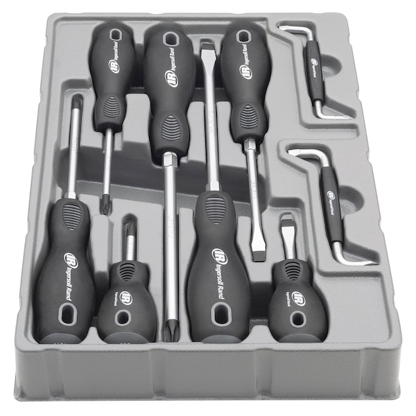 The Ingersoll Rand® features drivers that exceed ANSI specifications, built with premium double-injection Trilobular handles for maximum comfort and grip. Shafts are constructed of (SVCM) Silicon Vanadium Chrome Magnesium for added torque. Large size drivers have hex bolsters, and sizes are marked on the handle caps for easy size identification. • SET INCLUDES: Slotted - 1/4 x 1-1/2 Inch, 1/4 x 4 Inch, 5/16 x 6 Inch; Phillips - #2 x 1-1/2 Inch, #2 x 4 Inch, #3 x 6 Inch; Offset Screwdrivers - 3/16 Inch x #1 and Ľ Inch x #2 • FINISHED: SVCM (Silicon Vanadium Chromium Magnesium) Alloy Steel Blades with Sandblasted and Magnetized Tips, Large Size Drivers have Hex Bolsters for Added Torque When Needed • MAXIMUM COMFORT: Double Injection Soft Grip Trilobular Handles for Maximum Comfort and Grip • QUALITY: Exceeds ANSI Standards • INCLUDES: Durable Thermoform Tray that can easily fit in any tool box • COLOR: Black/Gray • MATERIAL: PP / TPR Double Injection Handles, (SVCM) Silicon Vanadium Chrome Magnesium Alloy Blades
