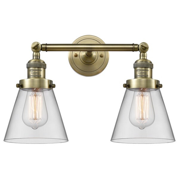 Small Cone 2-100 Watt 16 Inch Antique Brass Bathroom Fixture With Clear Glass And Solid Brass 180 Degree Adjustable Swivels