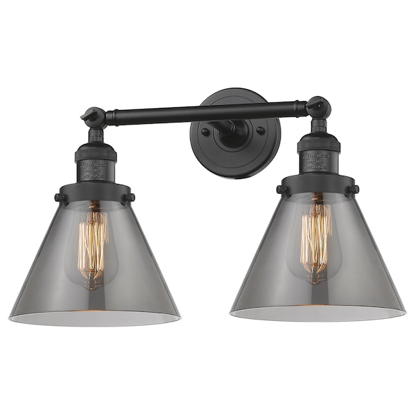 Large Cone 2-Vintage Dimmable Led 18 Inch Black Bathroom Fixture With Smoked Glass And Solid Brass 180 Degree Adjustable Swivels