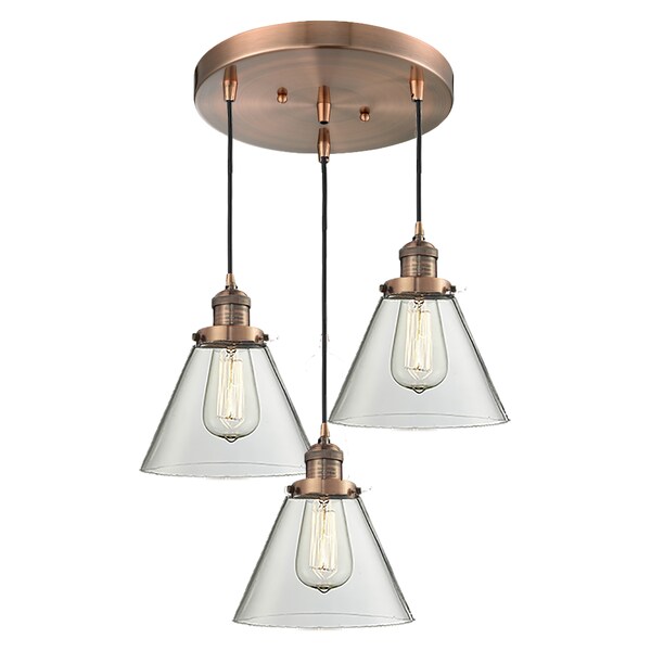 3 Light Large Cone 13In. Antique Copper Multi-Pendant With Clear Glass