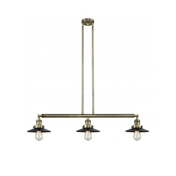 Railroad 3-100 Watt 36 Inch Antique Brass Island Light With Matte Black Railroad Shades And Solid Brass Hang Straight Swivels