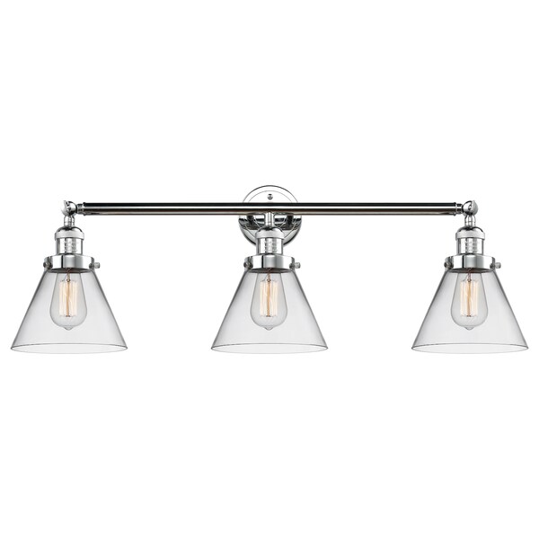 Large Cone 3-Vintage Dimmable Led 32 Inch Polished Chrome Adjustable Bathroom Fixture With Clear Glass