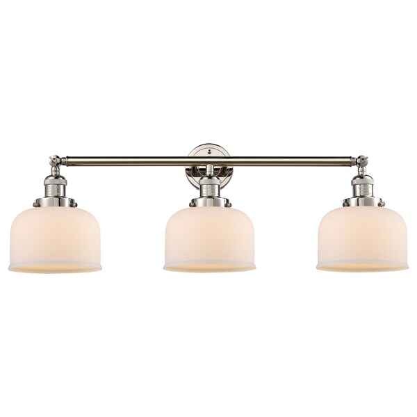 Large Bell 3-Vintage Dimmable Led 32 Inch Polished Nickel Adjustable Bathroom Fixture With Matte White Cased Glass