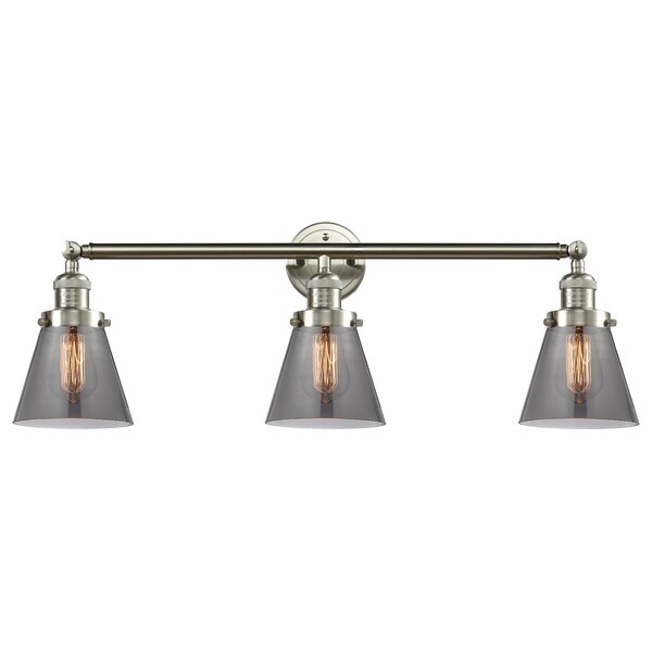 Small Cone 3-Vintage Dimmable Led 30 Inch Brushed Satin Nickel Adjustable Bathroom Fixture With Smoked Glass