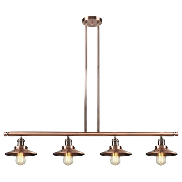 Railroad 4-Vintage Dimmable Led 48 Inch Antique Copper Island Light With Antique Copper Railroad Shades And Solid Brass Hang Straight Swivels