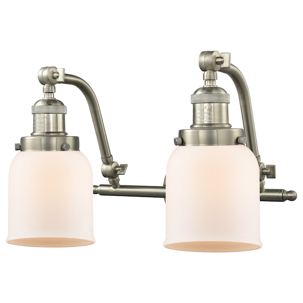 2 Light Adjustable Small Bell 18In. Brushed Satin Nickel Bathroom Fixture With Matte White Cased Glass