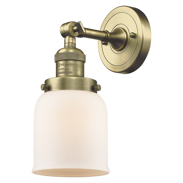 Small Bell 1-100 Watt 5 Inch Antique Brass Sconce With Matte White Cased Glass And Solid Brass 180 Degree Adjustable Swivel With Engraved Cast Cup