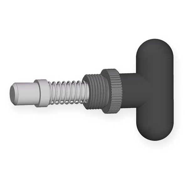 Weld Mount Retractable Spring Plunger, Thread Size 3/8-16, Thread Length 0.375 in, Nose Shape Short, Plunger Material Steel, Plunger Projection 0.563 in, Mounting Type Not Applicable, Body Length 1.81 in, Final Nose Force Not Applicable, Flange Thickness 0.22 in, Initial Nose Force Not Applicable, Overall Length 3.73 in, Plunger Width 0.5 in, Thread Pitch 0.063 in, Handle Type Rounded T-Knob, Body Finish Zinc, Body Material Steel, Handle Color Black, Handle Material Polypropylene