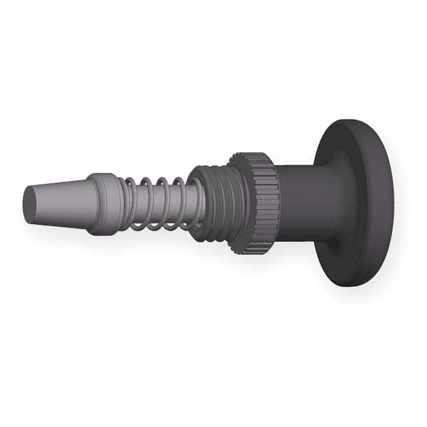 Weld Mount Retractable Spring Plunger, Thread Size 3/8-16, Thread Length 0.375 in, Nose Shape Tapered, Plunger Material Steel, Plunger Projection 0.625 in, Mounting Type Not Applicable, Body Length 1.81 in, Final Nose Force Not Applicable, Flange Thickness 0.26 in, Initial Nose Force Not Applicable, Overall Length 3.62 in, Plunger Width 0.5 in, Thread Pitch 0.063 in, Handle Type Pull Knob, Body Finish Zinc, Body Material Steel, Handle Color Black, Handle Material Polypropylene