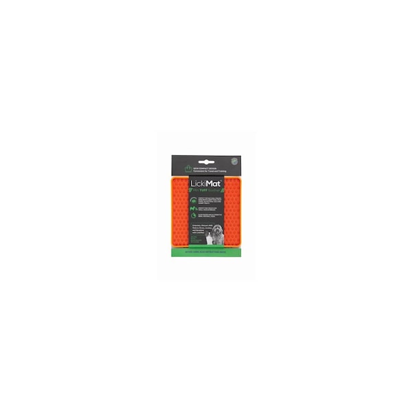 Orange mini tuff soother feeder. The mini tuff soother is used for small pets that tend to chew, or are teething. The Tuff mats are suitable for raw, wet, dry and liquid dog food, as well as any manner of dog treats and spreads. The soother design allows soft and liquid foods to be licked out with extra tongue simulation.