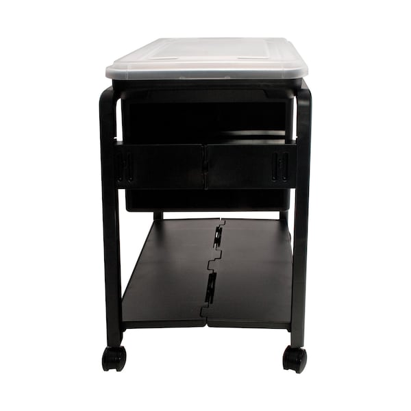 A cart that fulfils practicality and portability needs. This lightweight cart folds open to hold a storage tote accompanied by a lower shelf for additional supplies. Smooth-rolling castors allow for enhanced mobility. The included tote and snap-tight lid are perfect for legal-size letters and folders. Assembled cart measures: 18.5L x 14.5W x 21.75H.