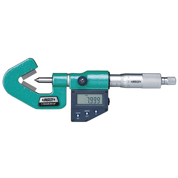 Digital V-Anvil Micrometer, Range 1.8 in to 2.6 in, 45 to 65 mm, Resolution 0.00005 in, Accuracy +/-0.0002 in, IP Rating IP65, SPC Output Yes, Data Output Type Cabled, Wireless, Long Form Calibration Certificate No, Anvil Shape V-Shaped, Anvil Size 0.256 in, Coolant Resistant Yes, Dimension Type Inch/Metric, Jaw Depth Not Applicable, Operation Type Digital, Thimble Type Ratchet, Anvil Material Carbide, Battery Size LR44, Case Included Yes, Case Type Case