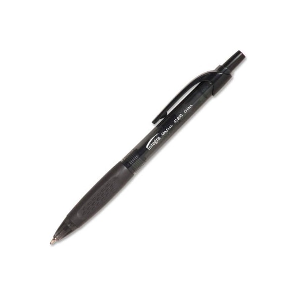 Integra ballpoint retractable pen, medium, black ink, dozen retractable ballpoint pens feature a textured rubber grip and clip. Rubber grip and clicker match the ink color. Barrel is transparent but slightly tinted the same as the ink color. Ink is water-resistant. Ballpoint pen is non-refillable. Pocket clip, rubber grip, visible ink supply & water resistant ink.