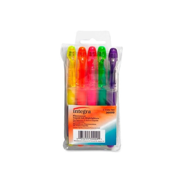 Integra liquid highlighter, chisel tip, assorted ink, 5 / set liquid ink highlighters offer a visible ink supply. Free flowing delivery system applies ink smoothly and evenly. Transparent liquid ink stays bright and resists fading. Non-refillable. Fade resistant.