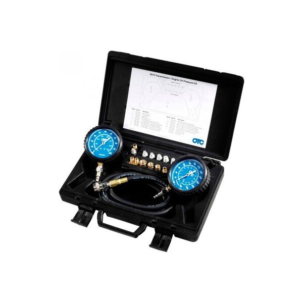 Otc trans/eng oil press tester - otc5610 features and benefits: large 3-1/2" gauges feature a chrome bezel and rugged protective outer boot high pressure gauge reads 0-400 psi and 0-2800 kpa low pressure gauge reads 0-100 psi and 0-700 kpa both gauges include rear hook to allow gauge to be hung conveniently out of the way gauges and hose assembly incorporate quick couplers for easy disconnect the otc-5610 professional kit can be used for domestic and import applications high and low pressure gauges make this kit useful for both transmission and engine work kit comes complete with adapter for most applications designed to be used for both static and on road testing kit includes 13 adapters and a detailed instruction manual blow molded hard case with removable lid