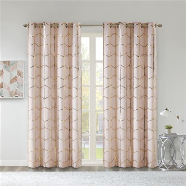 Freshen up your space with the enchanting style of Intelligent Design Raina Window Panel. The stunning panel flaunts a geometric, metallic gold print against a light blush ground for a fun and eye-catching look! Finished with a heavy 3 pass foamback liner, this panel is 100% total blackout providing energy efficiency and added privacy. Grommet top makes this panel easy to hang, open, and close through the day. Machine washable for easy care, complete the collection with coordinating bedding and shower curtain.