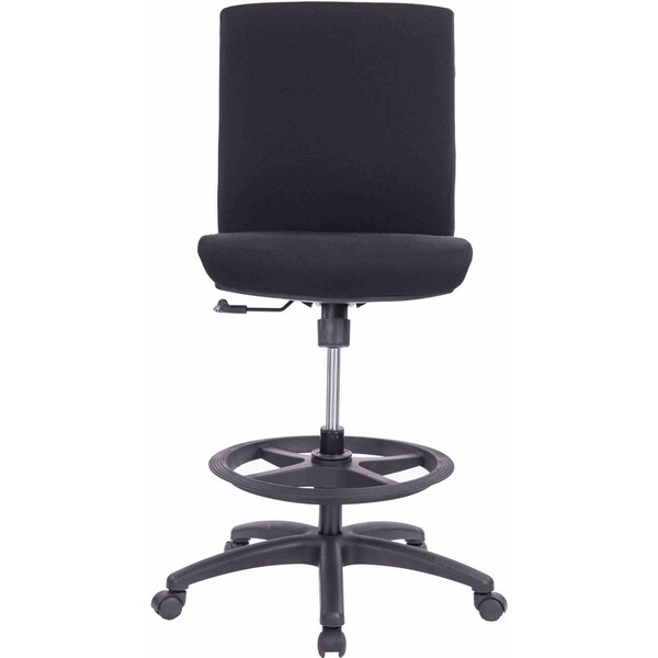 Interion All Fabric Drafting Stool, Armless. This armless fabric stool features a wide seat and back for maximum comfort. Commercial grade fabric upholsters a 3-1/4in thick seat and back. Black nylon base and foot ring with heavy duty casters. Base diameter measures a wide 27in diameter for optimal stability. Tilt Tension control with tilt lock. 300 lb weight capacity. Seat Dimensions - 20inW x 18.5inD x 23.5in - 31inH.