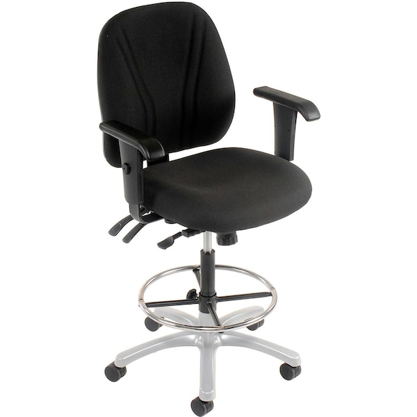 Interion Synchro Manager Stool - 360° Footrest With T Arms - Black . These Interion By Global Industrial stools are engineered to make personal positioning easy, so youftre more comfortable and productive. Back and seat angle adjust simultaneously to cradle your back for day long comfort. Pneumatic 24-3/4 to 28-1/4in seat height adjustment to ensure that your feet and legs are properly supported with the 7-1/2 to 11inH adjustable chrome footrest. Generous sized seat has extra thick 3-1/2in padding covered in durable 100% acrylic upholstery. Waterfall contoured design helps to reduce stress on knees and ensures proper circulation. Contoured back provides lumbar support and encourages proper posture. Independent adjustable back angle, tilt lock and back tilt tension adjustment. Manager Stool seat 20inW x 19-1/2inD, back 19-1/2inW x 20inH. Aluminum 5 blade base with steel reinforcement includes five 2in dual wheel carpet casters. Easy assembly. 2 Year Limited Warranty. 250 lbs weight capacity.