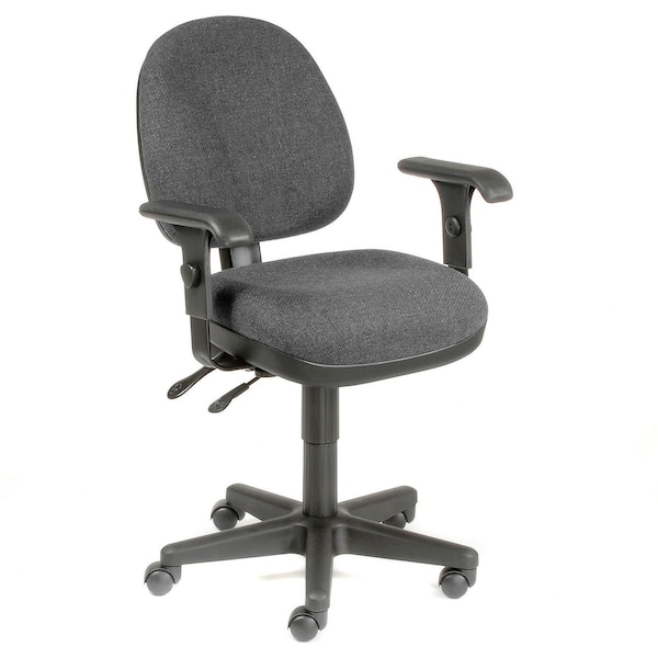 Fully adjustable seat height and angle help ensure that the body is kept in an ergonomically balanced position. Roomy 18in sq. seat has extra thick 3 1/2in padding that is covered in long lasting, durable acrylic fabric upholstery for an attractive look. Waterfall contoured seat helps to reduce stress on knees and helps ensure proper circulation. Contoured back provides lumbar support and encourages proper posture. Poly-shell back and seat base wonftt rip, chip or dent. 17in-22in seat height adjustment. Task features a 17 1/2in sq. back. Brand is Interion By Global Industrial/. Height adjustable T-arms align arms and wrist correctly for data entry work. Arms also adjust side-to-side. Polypropylene five-blade base with 2in dual-wheel carpet casters provide easy mobility. Easy assembly. 2 Year Limited Warranty.