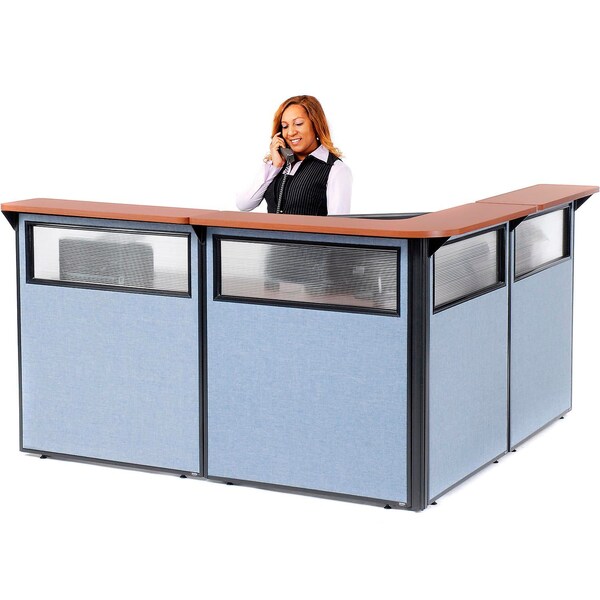 L-Shaped Reception Station with Window, 80inW x 80inD x 44inH, Cherry Counter, Blue Panel. Interion By Global Industrial reception stations with windows are built for strength, functionality and convenience Ideal for reception rooms and security areas. Reception counters and work surfaces are made using 1 thick scratch resistant laminate. 12inD reception counter provides a convenient writing surface for guest and visitors while maintaining personnel privacy. Desktops include 2-3/16in diameter cable management grommet openings. Desk framing is made of Black finished steel for strength that lasts. Reception station panels consist of Interion partitions which help reduce noise and create privacy. These reception stations feature a 5mm thick translucent polycarbonate window which allows light in while still maintaining privacy. These windows bring an elegant and upscale look to any office space, perfect for first impressions. Reception panels are flame retardant to meet the California 117 flammability standard. These 1-3/4 thick fabric upholstered panels feature an interior engineered wood MDF frame and honeycomb core covered with a heavy tackable liner for structural strength and support. Panel trim is finished with self-extinguishing extruded polymer that offers optimum safety and rigidity. Includes adjustable leveling feet that are ideal for uneven surfaces. L-Shaped Reception Station includes 36in corner desk and two 36inW x 24inD returns. Desks accept installation of Optional Storage options sold separately including Pedestal File, Keyboard Drawer and Mouse Tray. Easy assembly. 1 Year Limited Warranty.