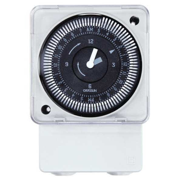 Electromechanical Timer, 24-Hour, Number of Poles 2, Contact Form SPDT, Voltage 120V AC, Amps 21 A, Contact HP @ 120V 1 hp, Contact HP @ 240V 2 hp, Day Skipper No, Enclosure Type Plastic, Min. Time Setting 15 min, Max. Time Setting 23 hr 45 min, Max. On/Off Cycles 48, Width 3 5/16 in, Depth 3 5/16 in, Height 4 51/64 in, Number of Trippers Included 96, Operating Temp. -4 Degrees to 131 Degrees F, Description/Special Features Battery Backup, Quartz Motor, Mount Surface/DIN Rail