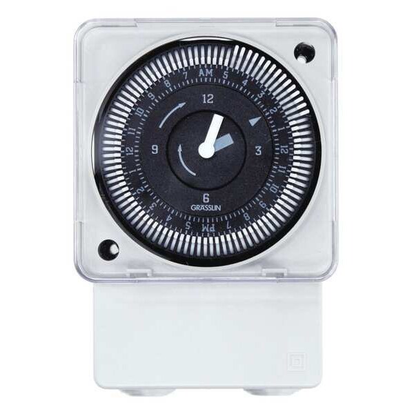Electromechanical Timer, 24-Hour, Number of Poles 2, Contact Form SPDT, Voltage 120V AC, Amps 21 A, Contact HP @ 120V 1 hp, Contact HP @ 240V 2 hp, Day Skipper No, Enclosure Type Plastic, Min. Time Setting 15 min, Max. Time Setting 23 hr 45 min, Max. On/Off Cycles 48, Width 3 5/16 in, Depth 3 5/16 in, Height 4 51/64 in, Number of Trippers Included 96, Operating Temp. -4 Degrees to 131 Degrees F, Description/Special Features Battery Backup, Override Switch, Quartz Motor, Mount Surface/DIN Rail