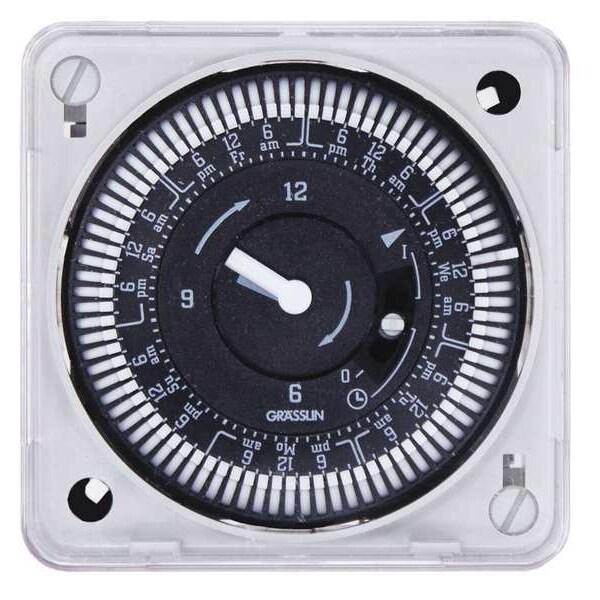 Electromechanical Timer, 7-Day, Number of Poles 2, Contact Form SPDT, Voltage 120V AC, Amps 21 A, Contact HP @ 120V 1 hp, Contact HP @ 240V 2 hp, Day Skipper Yes, Enclosure Type Plastic, Min. Time Setting 2 hr, Max. Time Setting 6 days 22 hr, Max. On/Off Cycles 48, Width 3 5/16 in, Depth 2 5/16 in, Height 3 51/64 in, Number of Trippers Included 96, Operating Temp. -4 Degrees to 131 Degrees F, Description/Special Features Battery Backup, Override Switch, Quartz Motor, Mount Flush