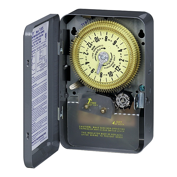 Electromechanical Timer, 24-Hour, Multioperation, Number of Poles 1, Contact Form SPDT, Voltage 208 to 277V AC, Amps 20 A, Contact HP @ 120V 1/2 hp, Contact HP @ 240V 1 hp, Day Skipper Yes, Enclosure Type Steel, NEMA Rating 1, Min. Time Setting 15 min, Max. Time Setting 23-3/4 hr, Max. On/Off Cycles 48, Width 5 in, Depth 3 in, Height 7 3/4 in, Number of Trippers Included 96, Extra Trippers 2E132, Operating Temp. -40 to +130