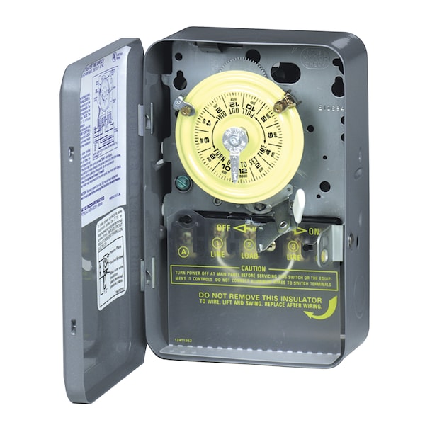 Electromechanical Timer, Mechanical and Digital Water Heater Timer, Number of Poles 2, Contact Form DPST, Voltage 208 to 240V AC, Amps 40 A, Contact HP @ 240V 5 hp, Day Skipper No, Enclosure Type Steel, NEMA Rating 1, Min. Time Setting 60 min, Max. Time Setting 23-1/2 hr, Max. On/Off Cycles 12, Width 5 in, Depth 3 in, Height 7 3/4 in, Number of Trippers Included 2, Extra Trippers 2E054, Mount Keyhole, Standards cCSAus, cULus, Nominal Max. Time Setting 24 hr