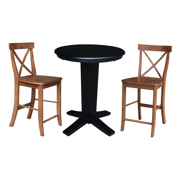 36 in. Solid Wood Round Top Dining Table with 2 Counter Height Stools in Black/Distressed Oak